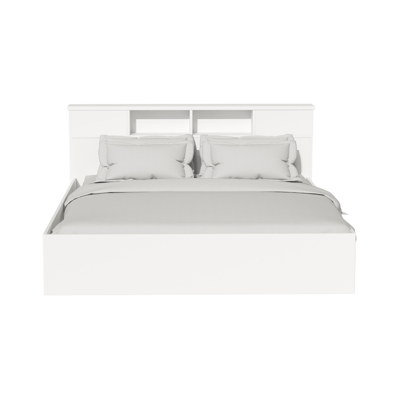 The decorative small shelves on the headrest and the vertical footboards elevate the overall aesthetic effect.
