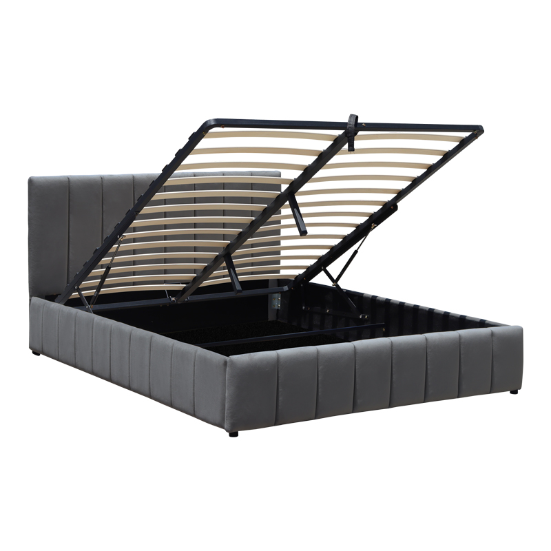 The bed features an easy-to-use mattress lift mechanism, which reveals a spacious storage area underneath. This makes it exceptionally easy to organize linens, pillows, out-of-season clothing, or other items, effectively contributing to the organization and tidiness of the space.