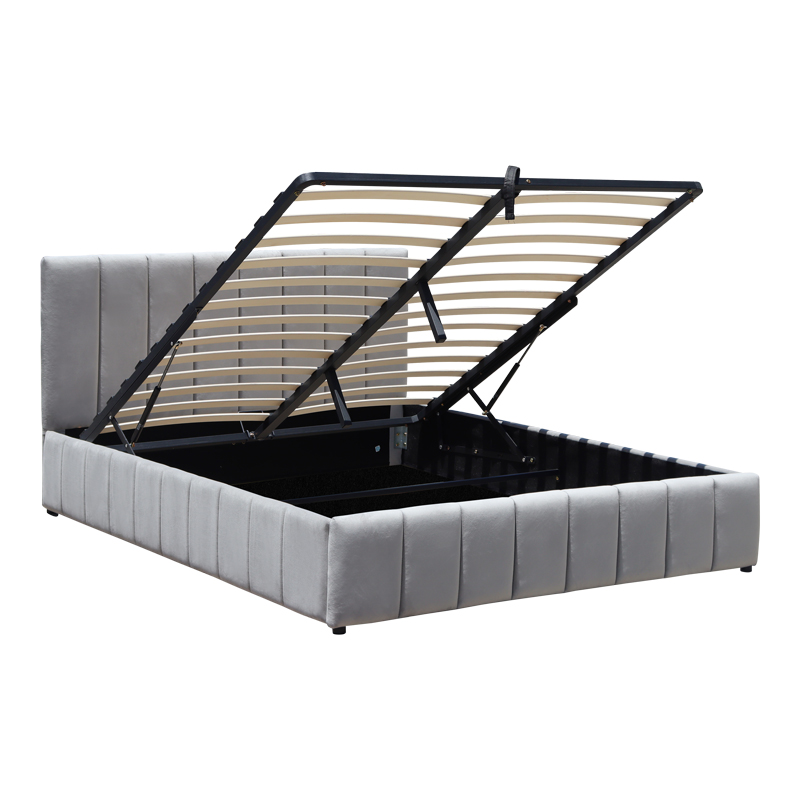 The bed features an easy-to-use mattress lift mechanism, which reveals a spacious storage area underneath. This makes it exceptionally easy to organize linens, pillows, out-of-season clothing, or other items, effectively contributing to the organization and tidiness of the space.