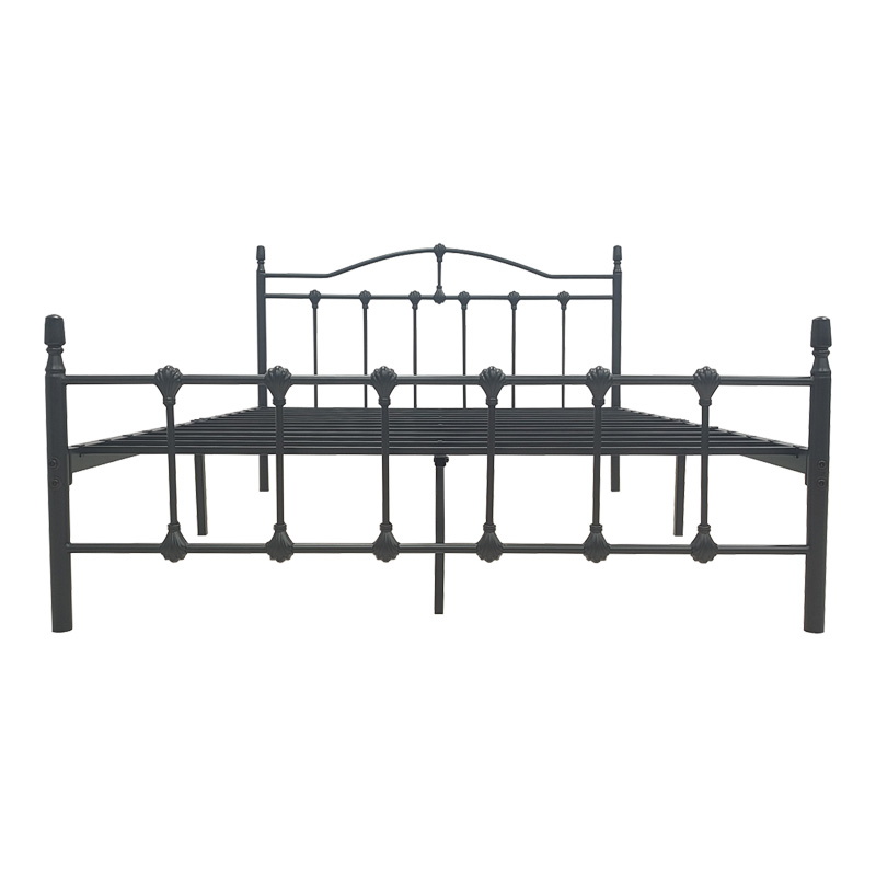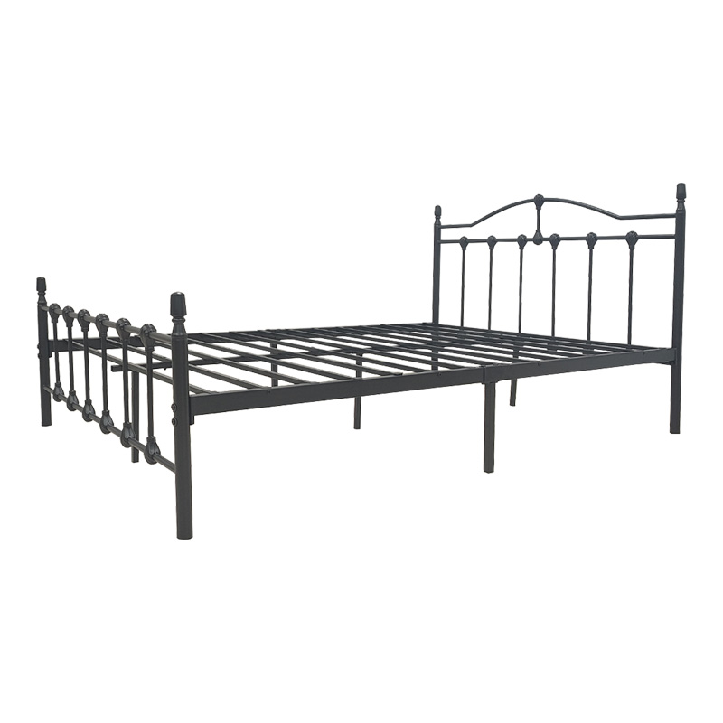 A stylish and durable bed with a metal frame, designed to offer sturdy support and an aesthetic upgrade to any bedroom. The bed features a decorative headboard with curved details and a matching, lower footboard, adding a character that is both classic and modern.