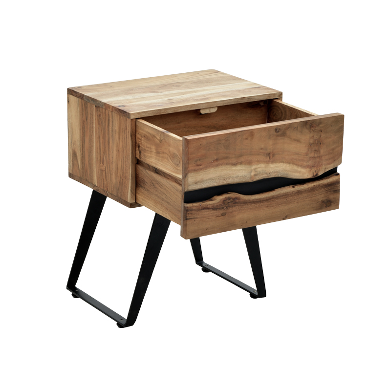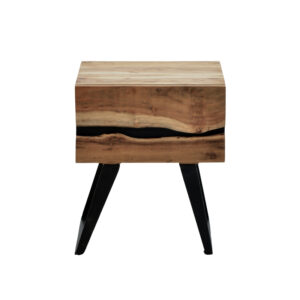 The Imena I Nightstand masterfully combines the raw beauty of natural wood with a modern, industrial touch. Its standout feature is the striking “crack” that runs across its front, creating a unique visual interest and highlighting its organic character.