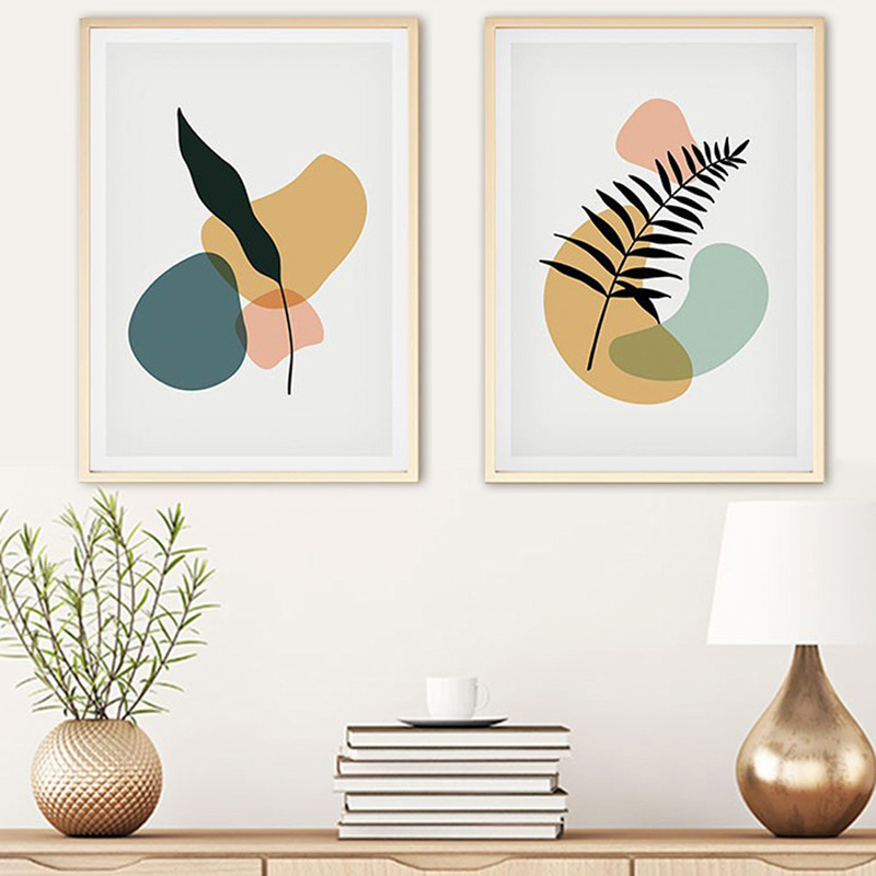 Enhance your space with the Keniko diptych painting, a playful composition of abstract shapes and leaves, as if colors and nature danced together. It brings a refreshing touch to any environment.