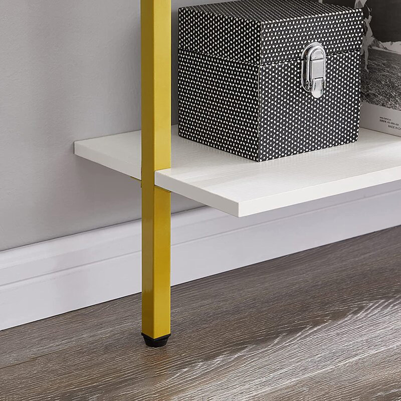 This contemporary 5-tier shelving unit offers a unique and stylish way to showcase your favorite books, plants, decorative items, or personal belongings. The sleek, minimalist design features a durable gold metal frame that contrasts beautifully with the white shelves, making it a versatile addition to any living room, bedroom, office, or even professional space.