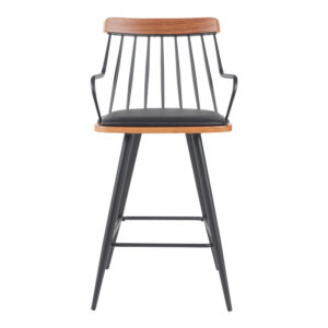 It features a comfortable seat framed by warm wooden accents. The backrest is composed of slim vertical metal rods supported by a horizontal wooden top piece, creating a visually striking contrast. Sleek metal armrests add both comfort and style. The sturdy metal base with four tapered legs and a circular footrest ensures durability and practical support.