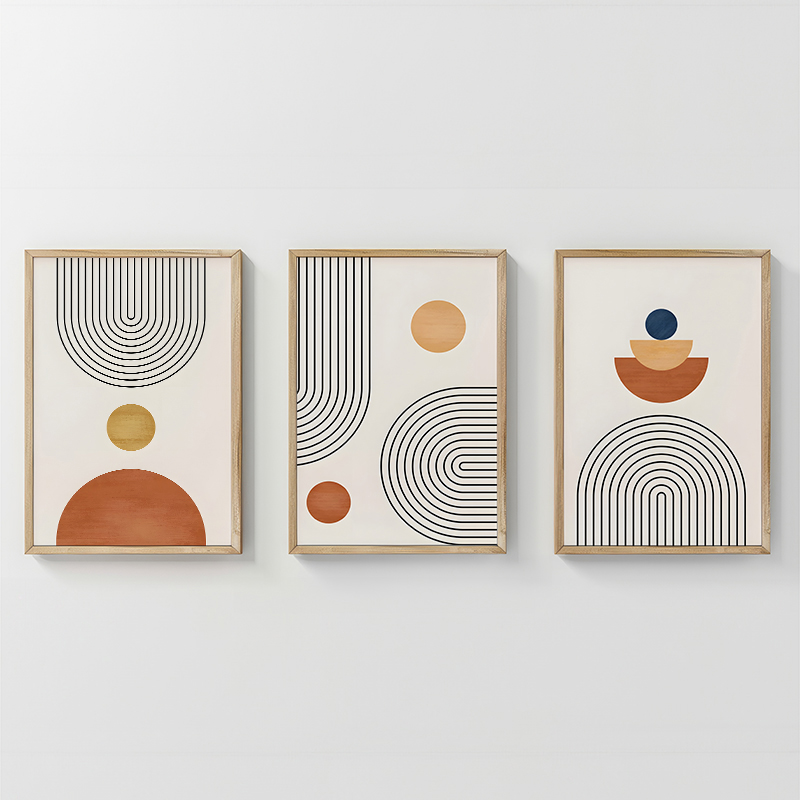 Bring into your space a piece that combines the order of geometric lines with the warmth of earthy colors, creating a dynamic, modern effect. The Lenda triptych is an aesthetic statement consisting of three separate, interacting pieces. Each panel features abstract geometric elements filled with fine, curved lines. This triptych adds depth, dynamism, and high aesthetic value to the space, ideal for modern living rooms and offices.