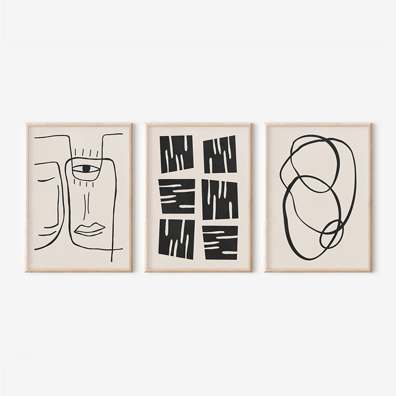 Upgrade your space with the eclectic power of abstract art: the Lumora Triptych is the ideal piece to give your walls a minimalist, multidimensional character. This three-piece composition, enhanced with high-resolution digital prints, brings together three distinct trends: free-flowing line art, geometric blocks, and organic curves, all in a striking contrast of black and soft beige. Through their dynamic and harmonious arrangement, they create a contemporary, refined visual rhythm and a strong aesthetic statement.