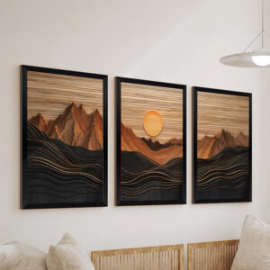 Travel to a dreamlike landscape with this set of three panels depicting the serenity of mountains under the sunset light. Their unique design creates a relief-like illusion, making your wall feel like a window into another world.